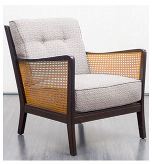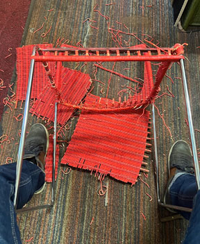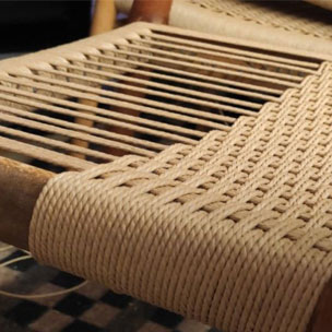 Oben: Neubespannungen an Tecta Kragstühlen mit Naturmaterial
