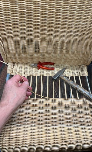 Bilder oben: Die Restaurierung eines Geflechtes an einem italienischen Design-Klassikers. Peddigrohr-Stahl-Stuhl