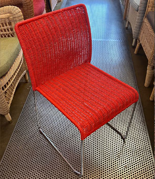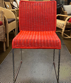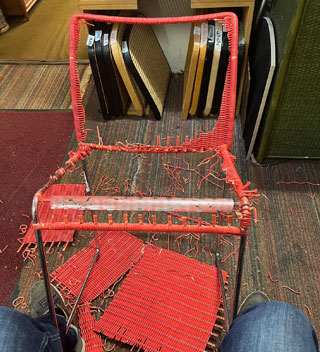 Bilder oben: Die Restaurierung eines Designer-Stuhls mit roter Lackierung - Komplette Erneuerung des Geflechtes mit Neulackierung